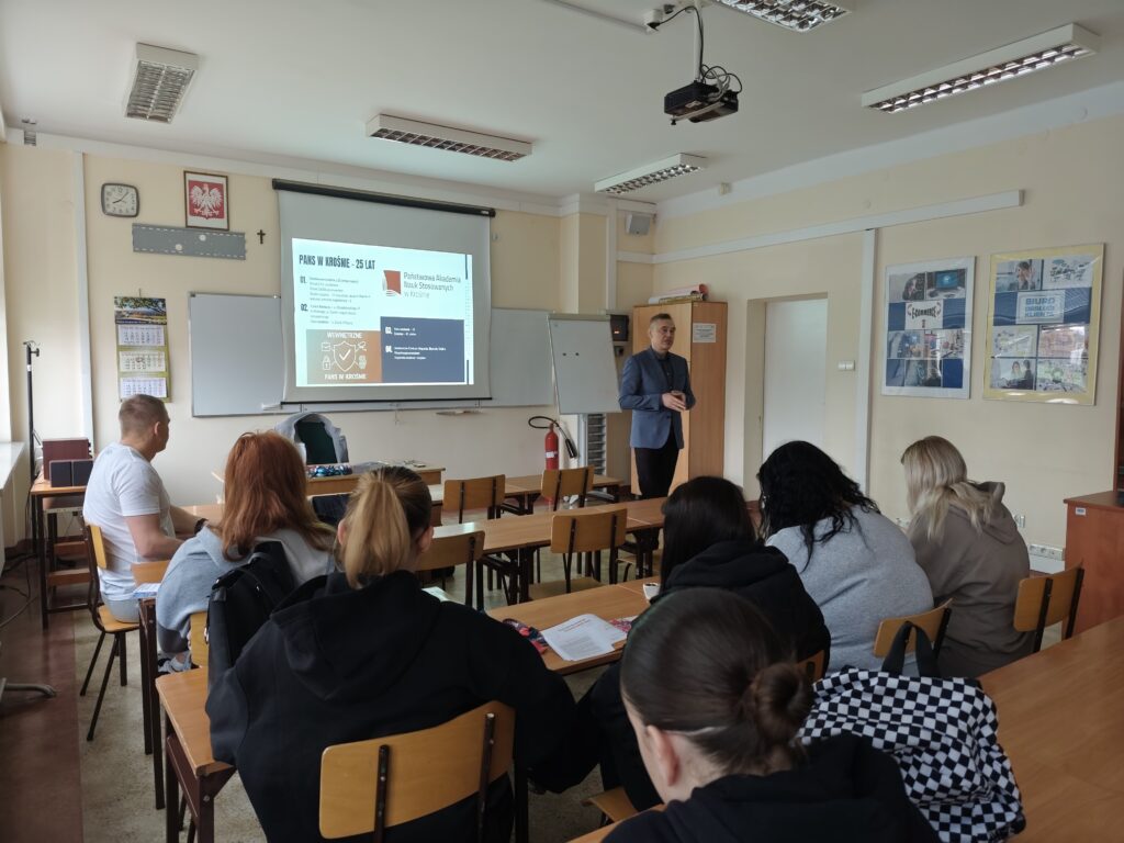 W dniu 09 kwietnia 2026 roku przedstawiciele Państwowej Akademii Nauk Stosowanych w Krośnie mieli okazję spotkać się z uczniami Zespołu Szkół Ponadpodstawowych im. Jana Szczepanika w Krośnie, aby zaprezentować ofertę edukacyjną PANS w Krośnie oraz kierunek Bezpieczeństwo Wewnętrzne.