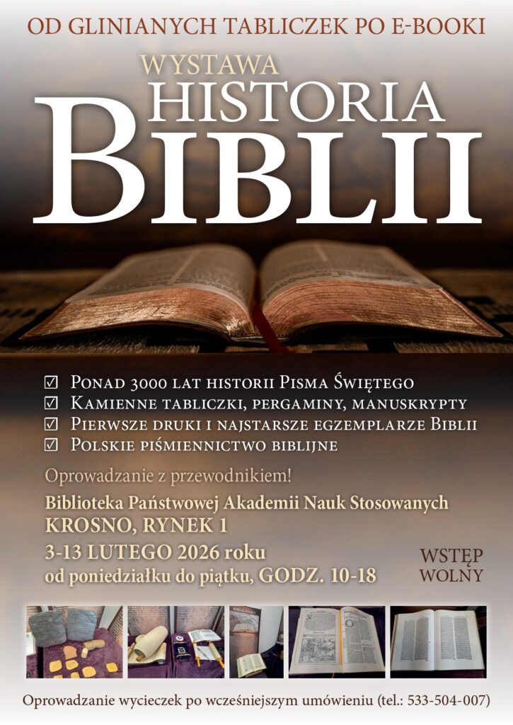Muzeum Historii Biblii w Ustroniu i Biblioteka Państwowej Akademii Nauk Stosowanych w Krośnie zapraszają na wystawę „Historia Biblii”, która prezentuje ponad 3000 lat dziejów powstawania, przepisywania i tłumaczenia Pisma Świętego – jednej z najważniejszych ksiąg w historii ludzkości.