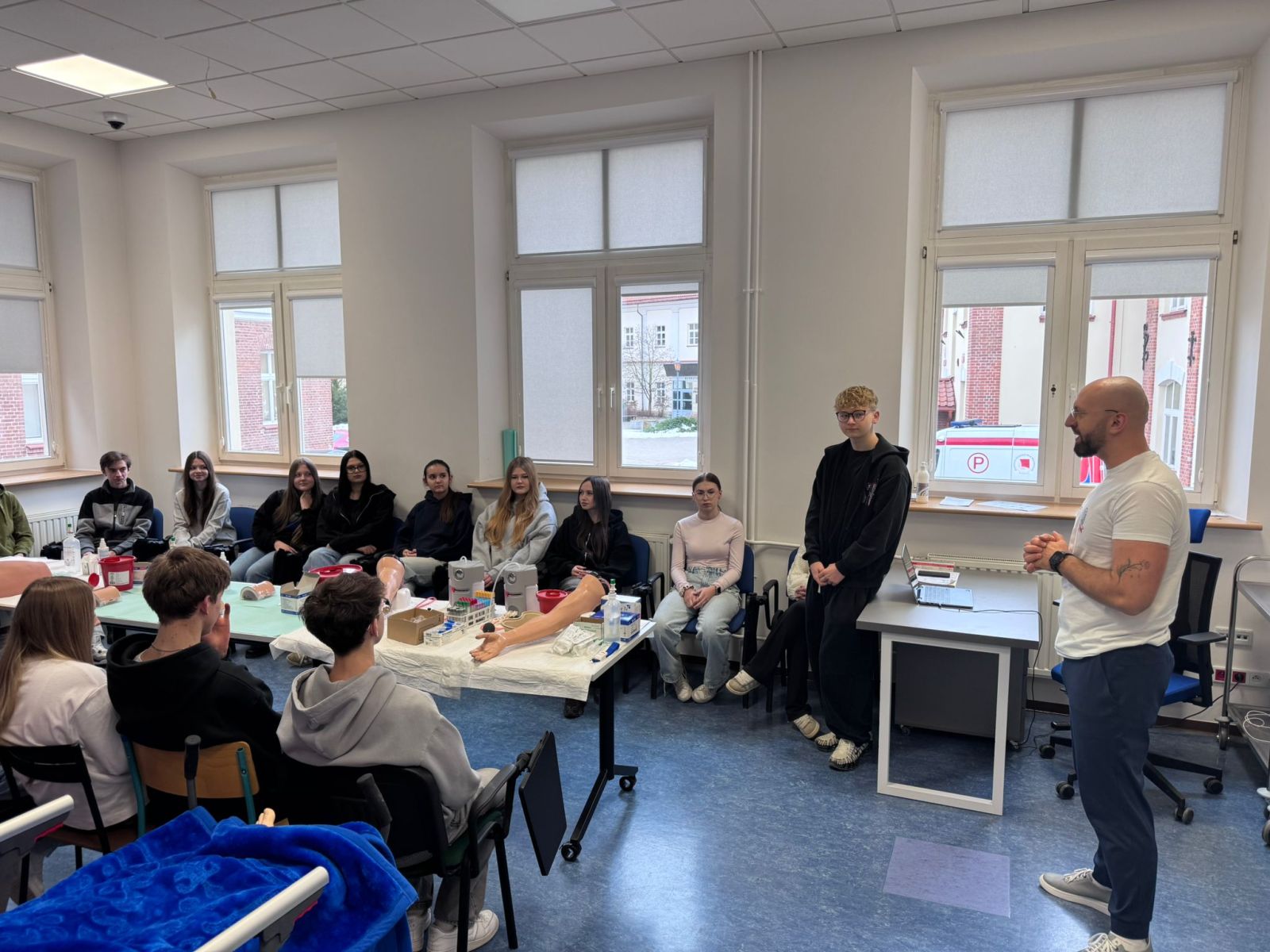 Podczas wizyty uczniowie poznali zasady udzielania pierwszej pomocy oraz procedury ratunkowe stosowane na etapie przedszpitalnym. W programie znalazł się także wykład pt. „Techniki zabiegów medycznych” oraz warsztaty z elementami ratownictwa medycznego. Uczestnicy mieli również okazję zapoznać się ze specyfiką kształcenia praktycznego w Centrum Symulacji Medycznej, gdzie nowoczesne metody nauczania wspierają przygotowanie do pracy w zawodach medycznych.