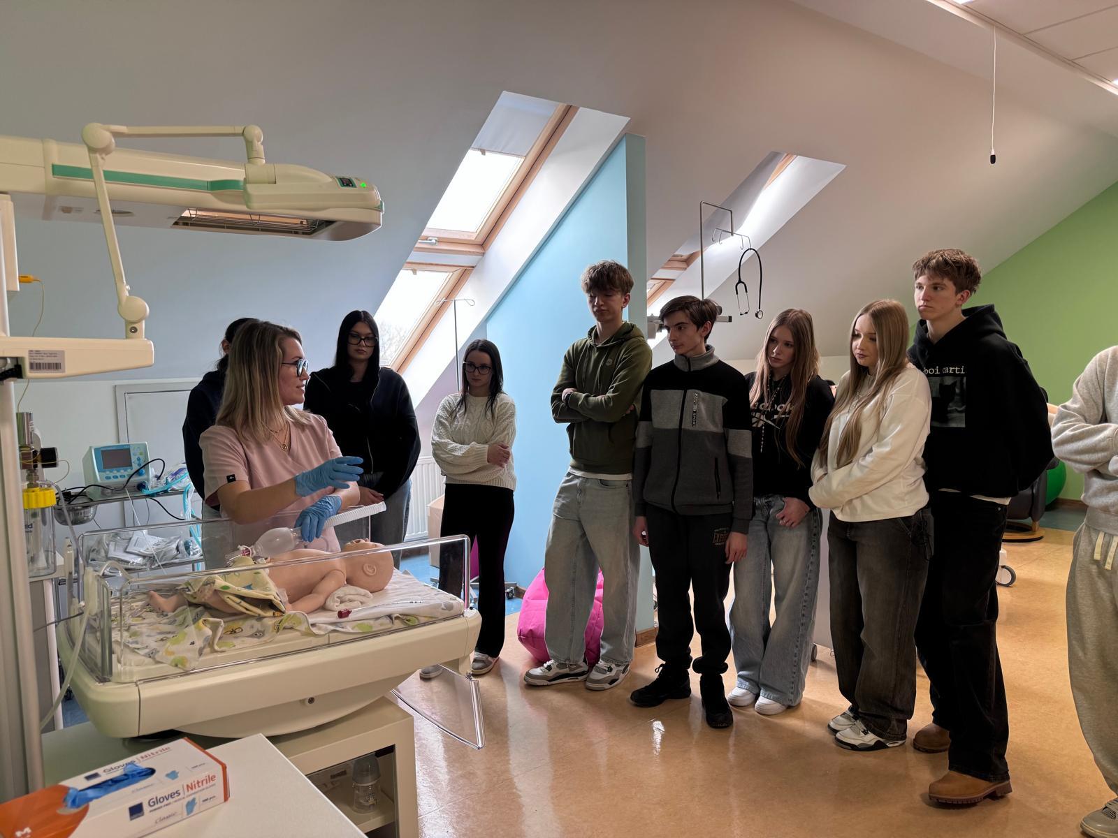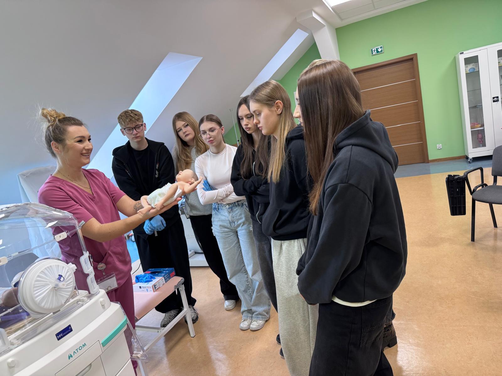 Podczas zajęć z położnictwa uczniowie mieli okazję zapoznać się ze specyfiką pracy położnej oraz samodzielnie spróbować wybranych procedur medycznych związanych z opieką nad kobietą ciężarną i noworodkiem. W trakcie warsztatów zaprezentowano m.in. intubację noworodka na fantomie, badanie piersi, badanie zewnętrzne kobiety rodzącej z wykorzystaniem chwytów Leopolda oraz elementy badania wewnętrznego.