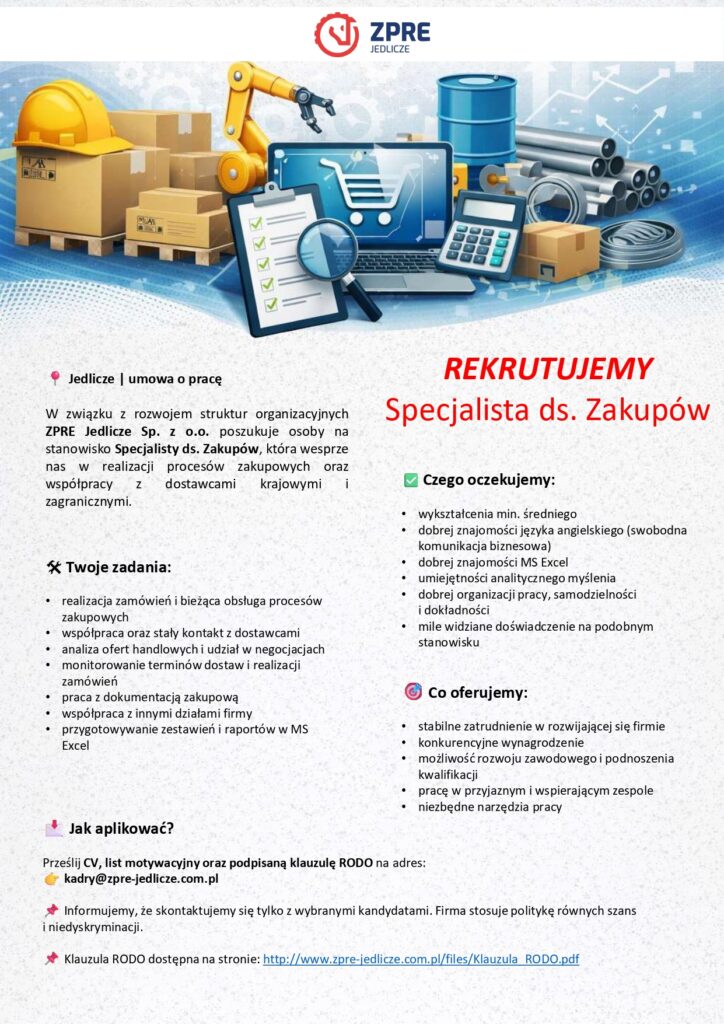 W związku z rozwojem struktur organizacyjnych ZPRE Jedlicze Sp. z o.o. poszukuje osoby na