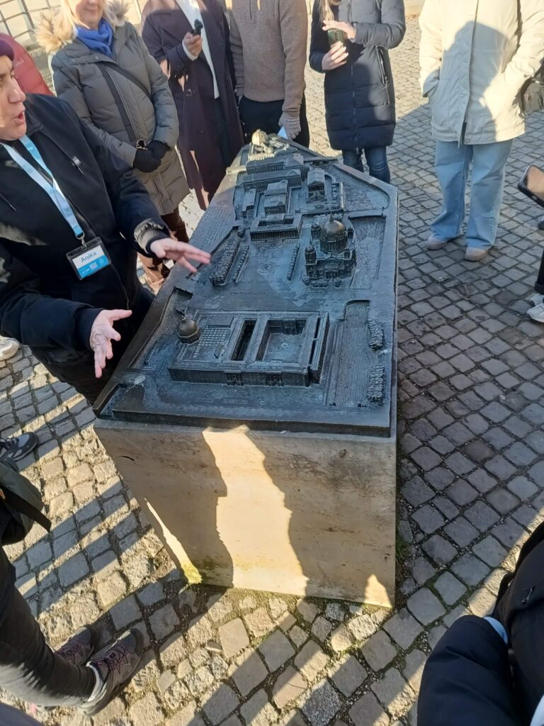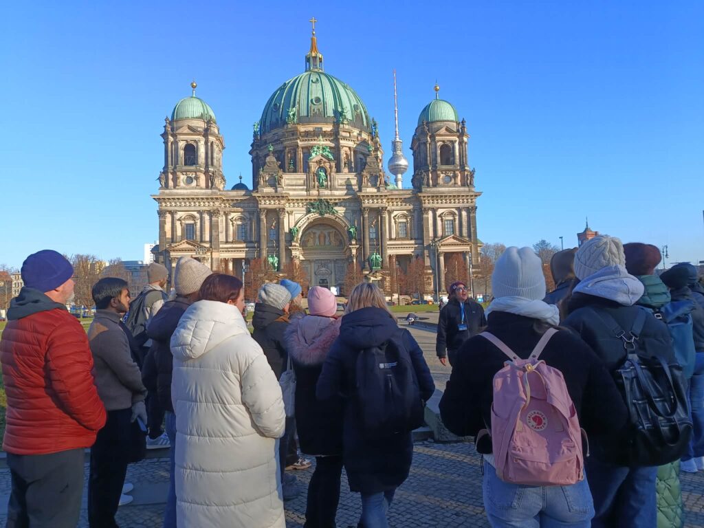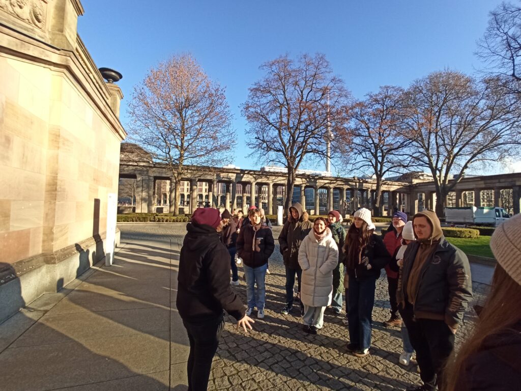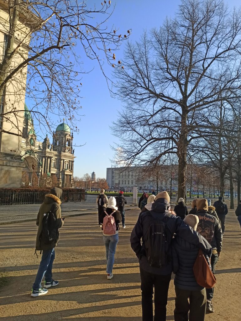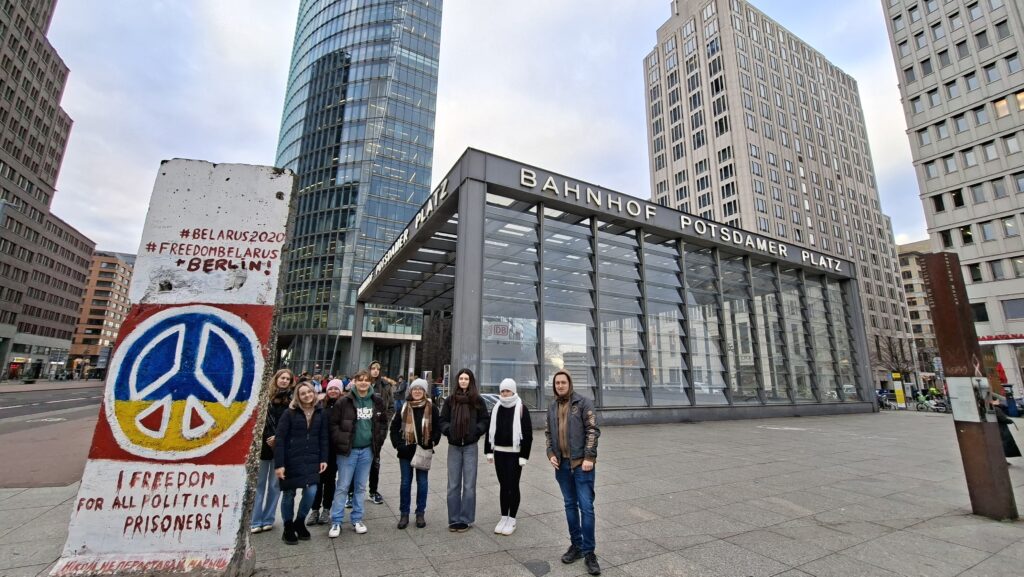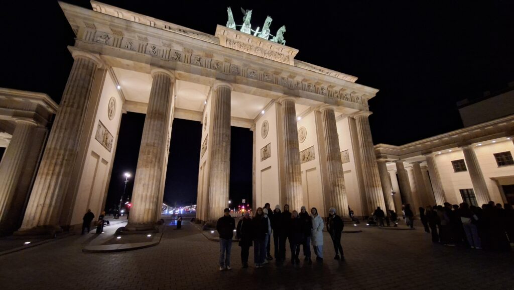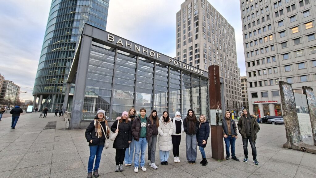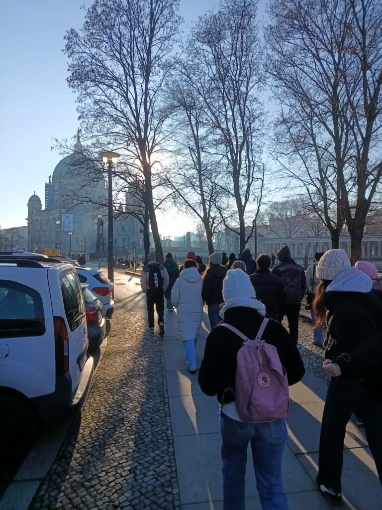 W środę zaczęliśmy zwiedzanie od spaceru z przewodnikiem po najważniejszych atrakcjach Berlina. Pani przewodnik bardzo szczegółowo i ciekawie opowiedziała o wszystkich atrakcjach i chętnie odpowiadała na nasze pytania. Swoją przygodę rozpoczęliśmy przy moście Friedrichsbrücke nad rzeką Szprewą, która stanowi ważny punkt orientacyjny i komunikacyjny w sercu Berlina. Następnie udaliśmy się na Wyspę Muzeów, gdzie znajduje się kompleks pięciu słynnych muzeów wpisanych na Listę Światowego Dziedzictwa UNESCO, prezentujących dzieła sztuki i skarby historyczne od starożytności po XIX wiek. Dalej przeszliśmy przez ogród Lustgarten – miejsce wypoczynku dla turystów chcących zwiedzić ewangelicką katedrę Berliner Dom, nawiązującą stylem do renesansu i baroku. Kolejnym przystankiem wycieczki był Bebelplatz – historyczny plac w centrum Berlina otoczony zabytkowymi budynkami takimi jak Opera Państwowa i Katedra św. Jadwigi. Plac zapisał się w historii jako miejsce, gdzie naziści palili książki. W jego centralnej części placu, pod ziemią, znajduje się symboliczny pomnik w formie pomieszczenia z pustymi regałami. Kolejnym punktem wycieczki był Checkpoint Charlie, czyli jedno z przejść granicznych między Berlinem Zachodnim a Wschodnim w czasach zimnej wojny, symbol podziału miasta. Idąc dalej zobaczyliśmy fragmenty muru berlińskiego i miejsce, gdzie znajdował się kompleks schronów przeciwlotniczych Führerbunker, gdzie ukrywał się Hitler. Ważnym punktem wycieczki był Pomnik Pomordowanych Żydów Europy, upamiętniający ofiary Holocaustu. Wycieczka zakończyła się przy słynnej Bramie Brandenburskiej – jednym z najbardziej rozpoznawalnych symboli Berlina.
