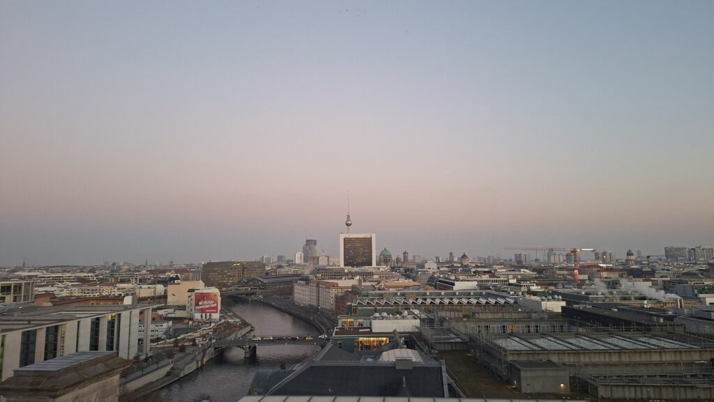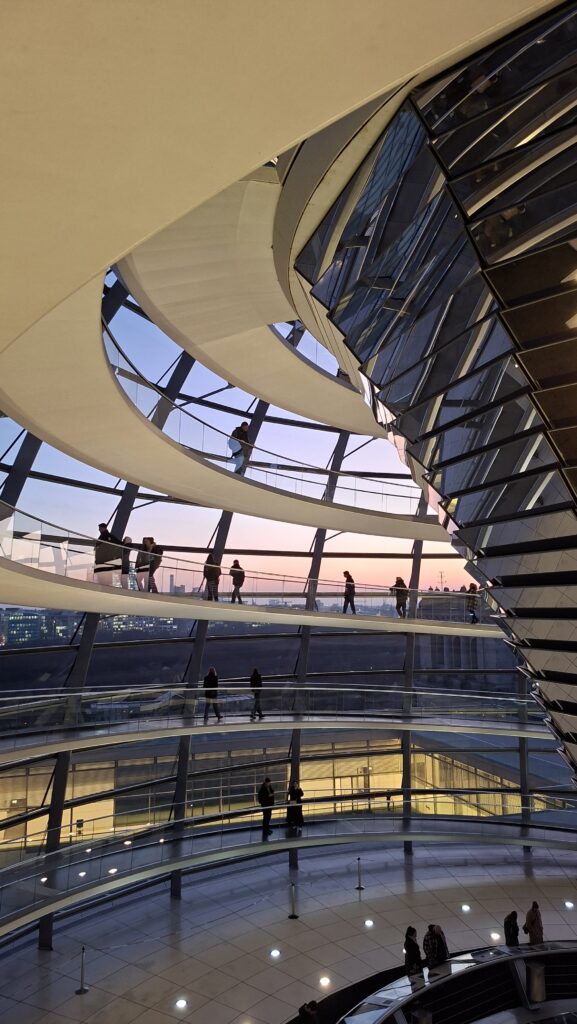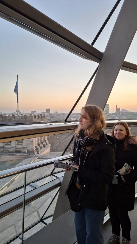 Zachód słońca podziwialiśmy z kopuły gmachu Reichstagu. Mieliśmy stamtąd doskonały widok na całą panoramę Berlina oraz na obradujących poniżej parlamentarzystów.
