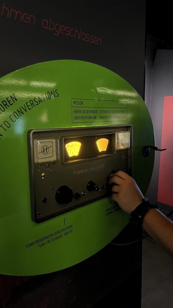 Czwartek zaczęliśmy od wizyty w Spionagemuseum, czyli muzeum szpiegostwa. Jest to nowoczesne interaktywne muzeum poświęcone historii szpiegostwa od czasów starożytnych po współczesne. Ekspozycja muzeum prezentuje rozwój szpiegostwa na tle wydarzeń politycznych i militarnych, ze szczególnym uwzględnieniem XX wieku, okresu zimnej wojny oraz podziału Niemiec. Muzeum wyróżnia się dużą liczbą multimedialnych i interaktywnych stanowisk. Spróbowaliśmy swoich sił między innymi w łamaniu szyfrów, przejściu przez laserowy tor przeszkód, dekodowaniu haseł, czytaniu z ruchu warg oraz włamywaniu się do sejfu. Zapoznaliśmy się również z technikami inwigilacji i ochrony danych stosowanymi we współczesnym świecie. Dużą atrakcją były również oryginalne oraz zrekonstruowane gadżety szpiegowskie, takie jak miniaturowe aparaty, ukryte mikrofony, narzędzia do szyfrowania informacji czy auto szpiegowskie.