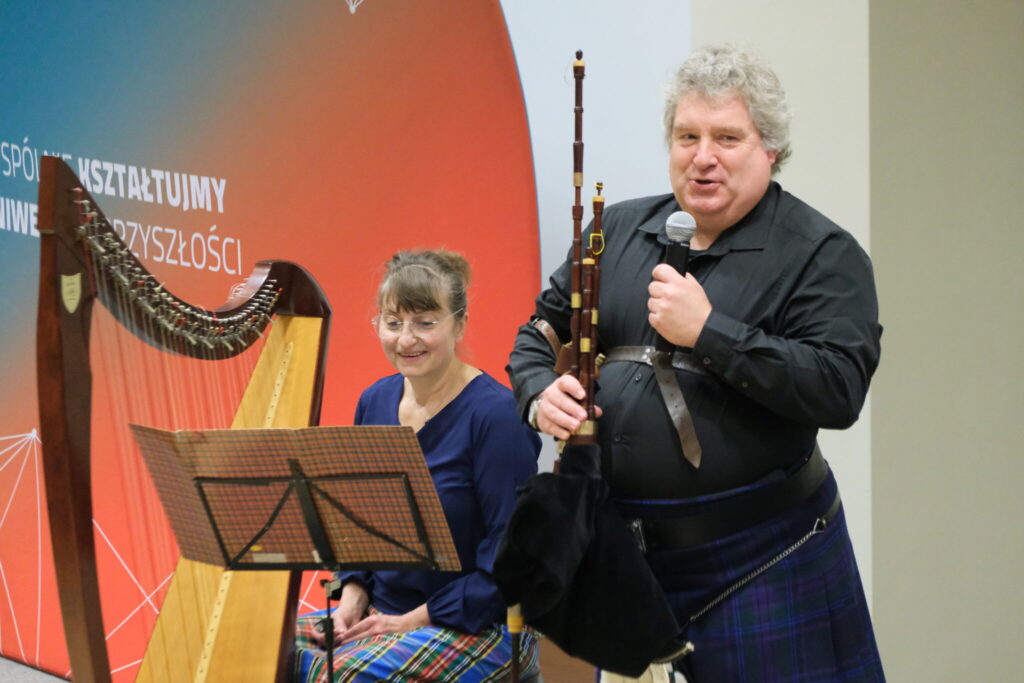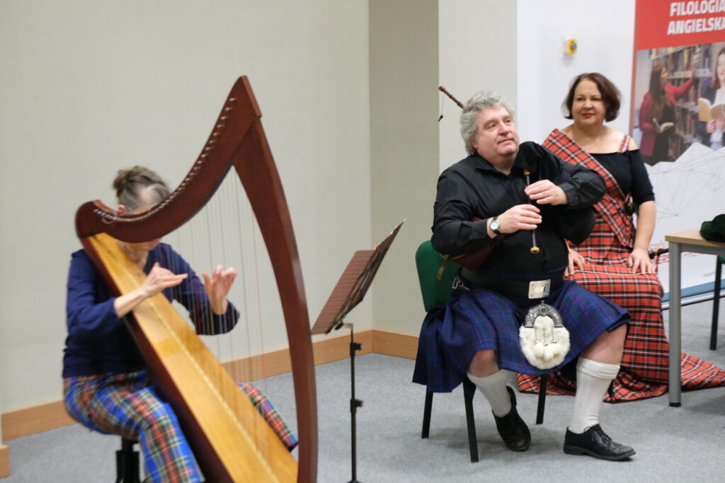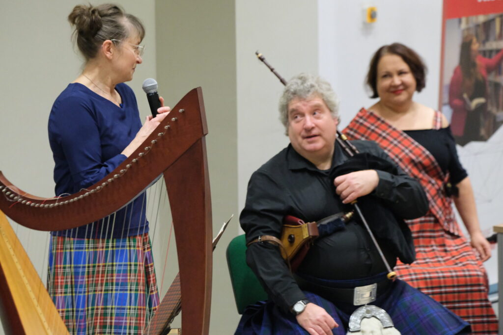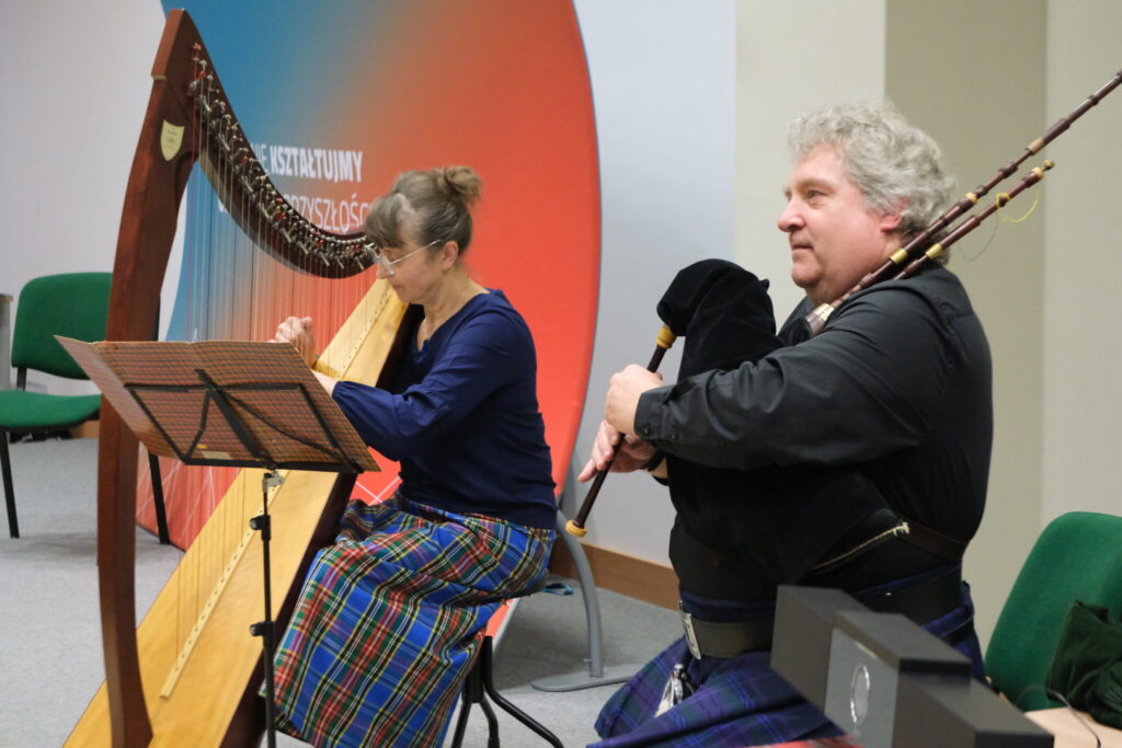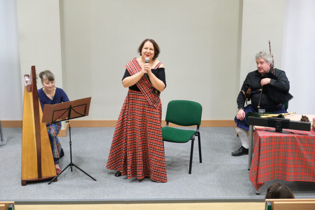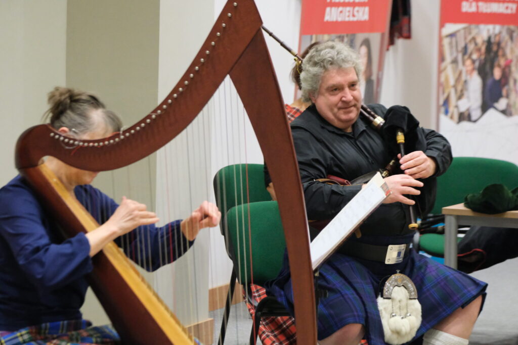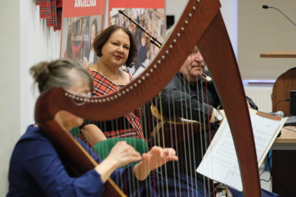 A skoro o muzyce – występ zespołu Celtic Triangle oczarował publiczność skutecznie! Cudowne wykonanie szkockich pieśni, między innymi do słów poety, Roberta Burnsa przez p. Katarzynę Wiwer, kompozycje mistrza gry na dudach p. Lindsaya Davidsona, tradycyjne szkockie melodie zagrane na harfie przez p. Irenę Czubek-Davidson zabrały wszystkich w tam gdzie mgła nad loch, wichry w Highlandach i woń torfowisk. Kiedy na koniec zabrzmiała Auld Lang Syne, żal było się żegnać!