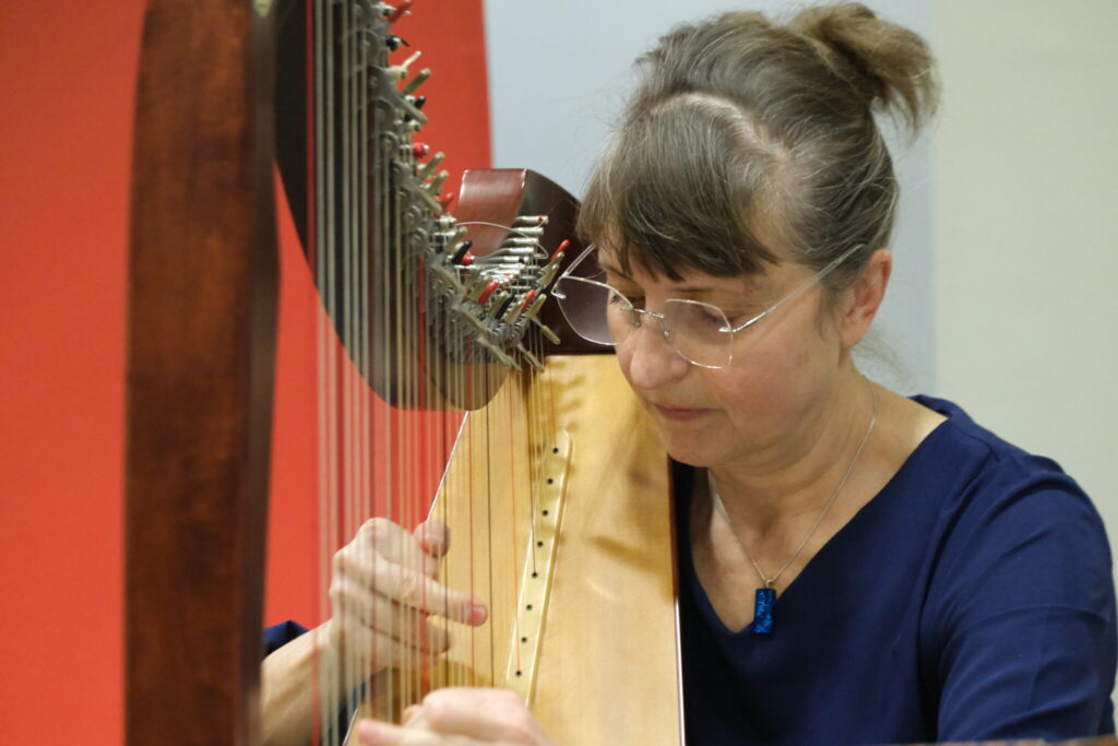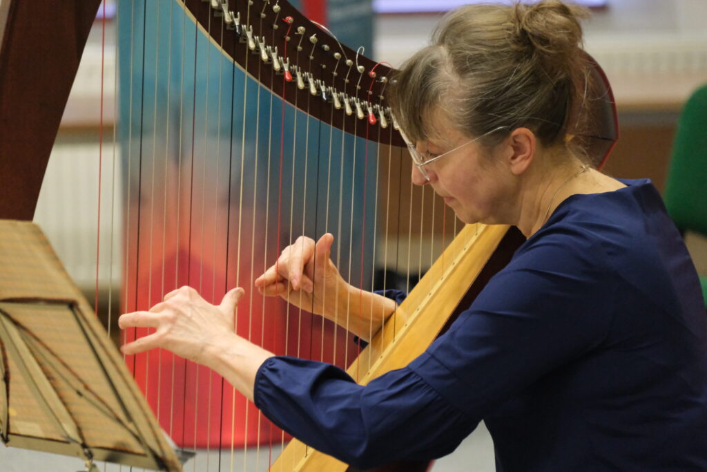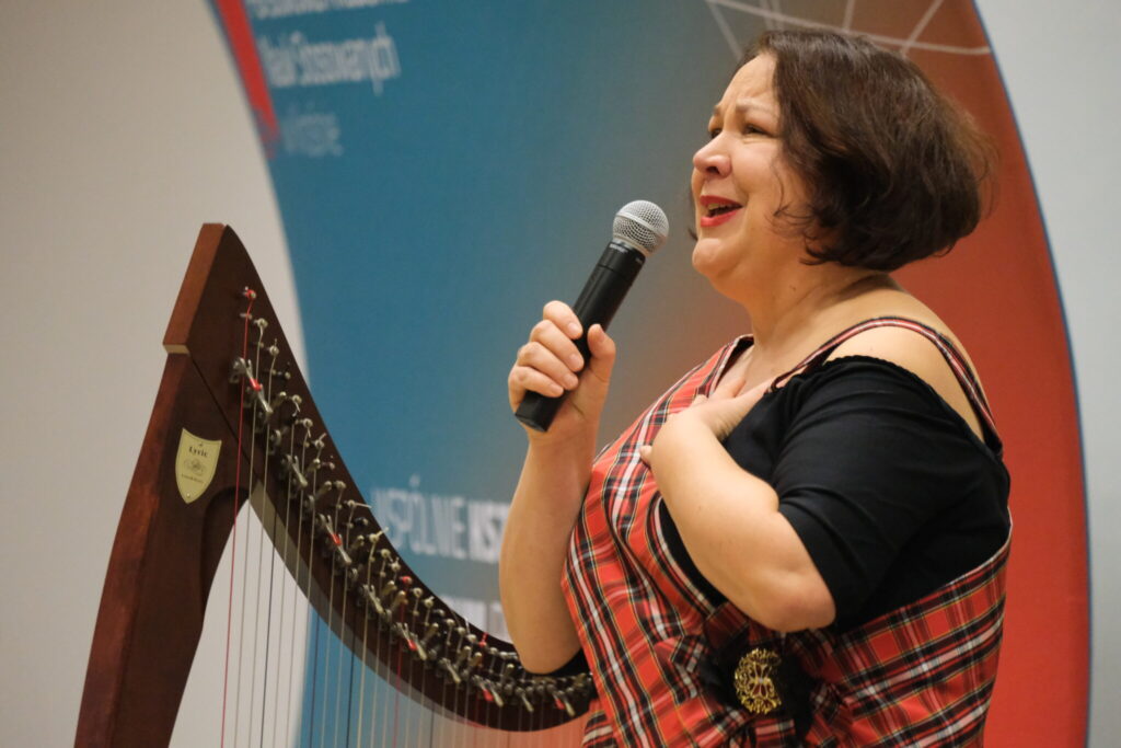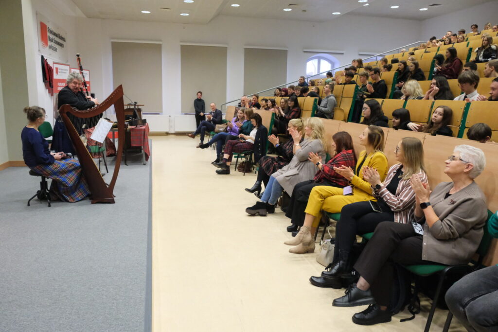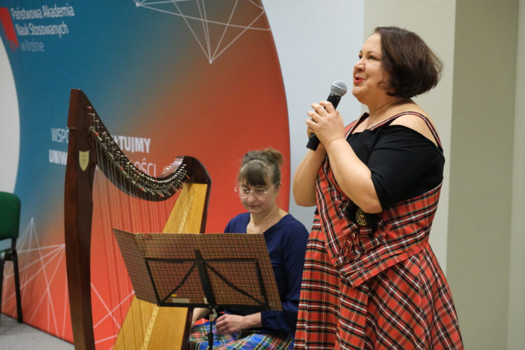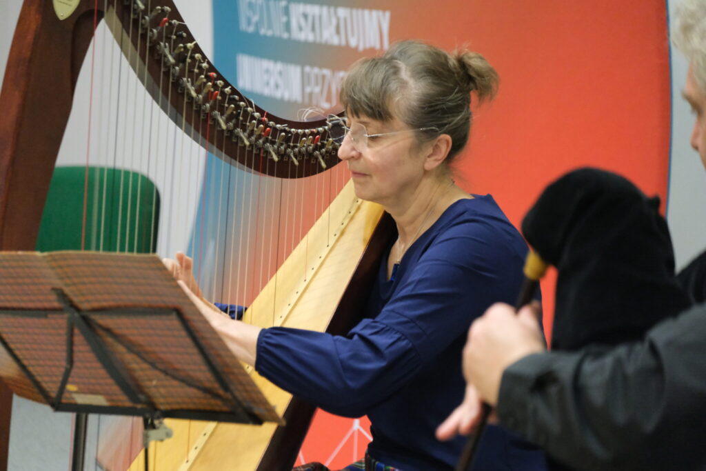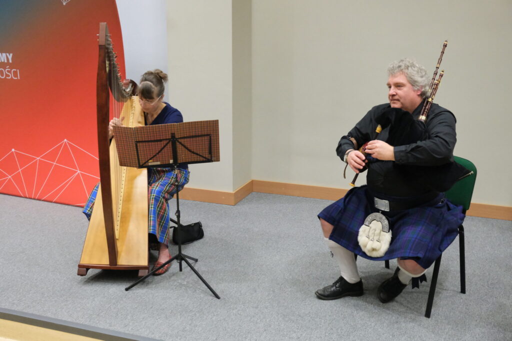 A skoro o muzyce – występ zespołu Celtic Triangle oczarował publiczność skutecznie! Cudowne wykonanie szkockich pieśni, między innymi do słów poety, Roberta Burnsa przez p. Katarzynę Wiwer, kompozycje mistrza gry na dudach p. Lindsaya Davidsona, tradycyjne szkockie melodie zagrane na harfie przez p. Irenę Czubek-Davidson zabrały wszystkich w tam gdzie mgła nad loch, wichry w Highlandach i woń torfowisk. Kiedy na koniec zabrzmiała Auld Lang Syne, żal było się żegnać!