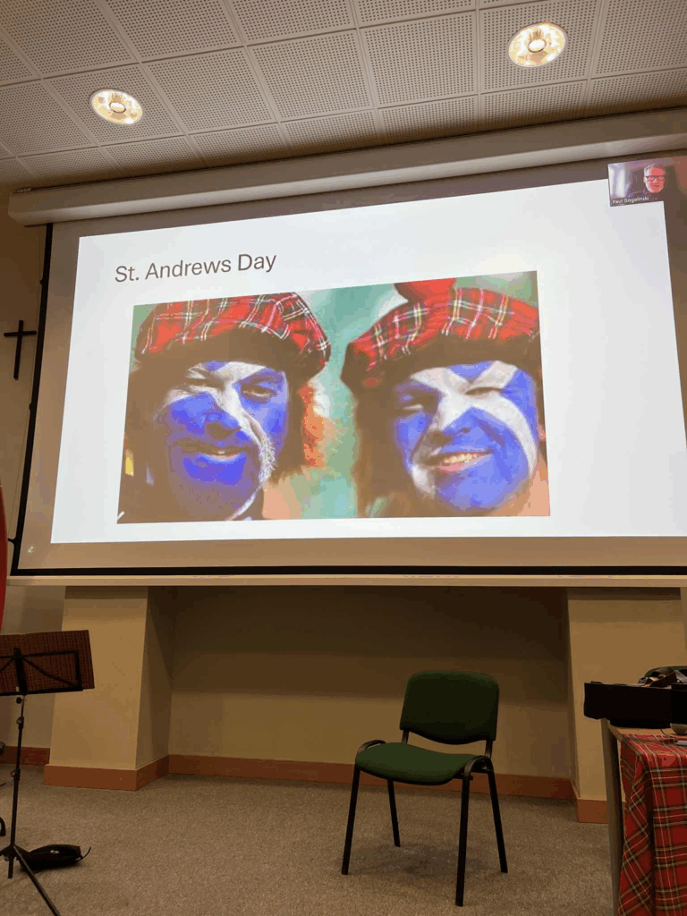Po krótkim refuelingu kruchymi ciasteczkami shortbread, była gawęda p. Paula Ramsaya Gogolińskiego, który opowiedział nam niezwykłą rodzinną historię, jak tato – Polak pokochał Szkocję, a syn – Szkot upodobał sobie Polskę. I o tym, że w każdym Szkocie jest trochę wojownika, trochę poety i dużo miłości do dobrej muzyki.