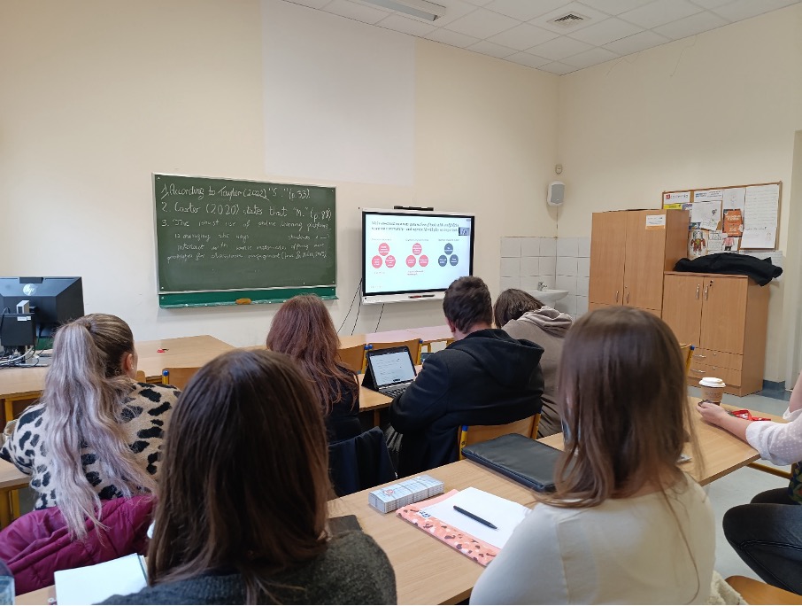 Prowadząca pokazała studentom funkcję Copilot, która służy do bardzo specjalistycznego szukania różnych informacji w publikacjach. Pokazała mapy koncepcyjne, tzw. summaries, które pokazują powiązania między różnymi tematami, a także wskazują kluczowe prace i ich autorów. Pokazała charakterystyczne rzeczy dla tego urządzenia, czyli np. możliwość zadawania pytań w języku codziennym, które sztuczna inteligencja przetworzy i znajdzie w odpowiedniej publikacji, a także wspomniała o kwestii ograniczenia tzw. halucynacji, które ograniczają ryzyko generowania nieprawdziwych informacji, ponieważ to urządzenie korzysta wyłącznie z treści zweryfikowanych w bazie Scopus.