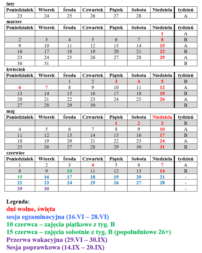 Harmonogram zajęć Harmonogramy zajęć na semestr letni roku akad. 2025/26. I rok II rok III rok Kalendarz semestru letniego, rok akad. 2025/26: oznaczenia na harmonogramie w USOS: tydzień A=tydzień nieparzysty, tydzień B = tydzień parzysty