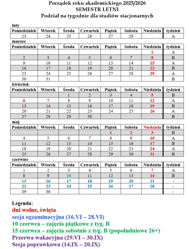 Kalendarz akademicki, semestr letni 2025/2026: