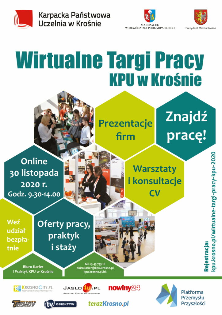 Serdecznie zapraszamy wszystkich studentów naszej uczelni na Wirtualne Targi Pracy KPU w Krośnie, które odbędą się w dniu 30 listopada 2020 roku, w godz. 9.30 — 14.00.