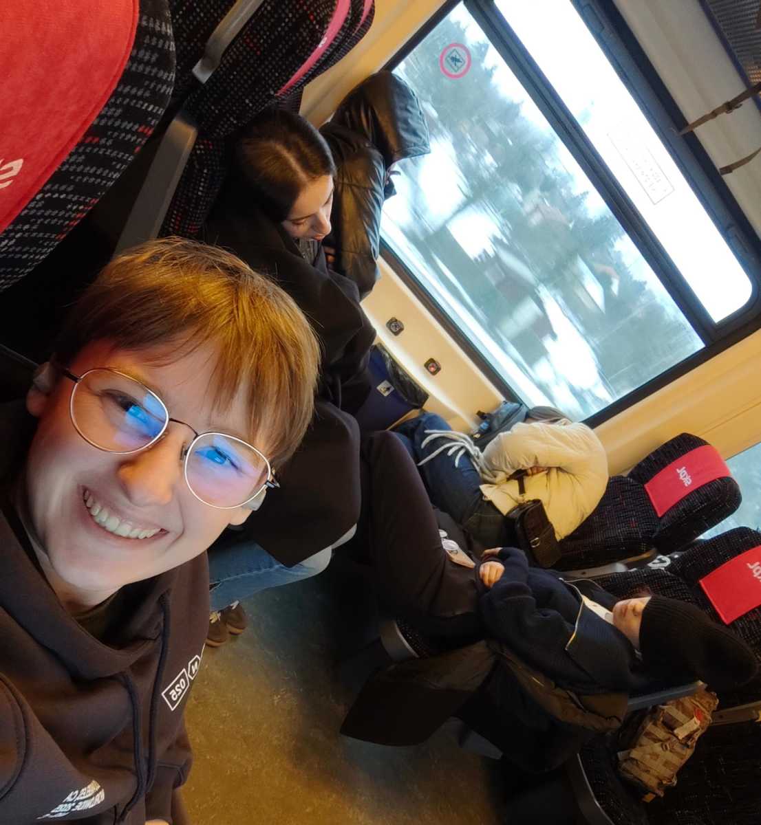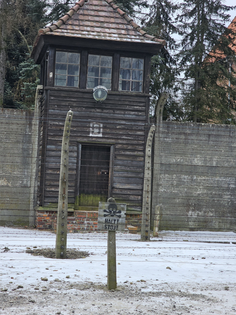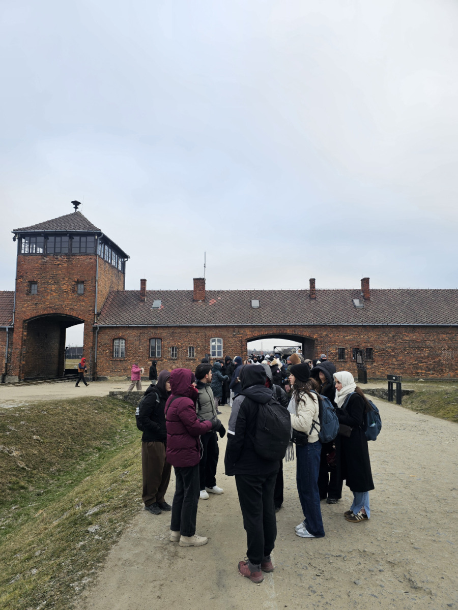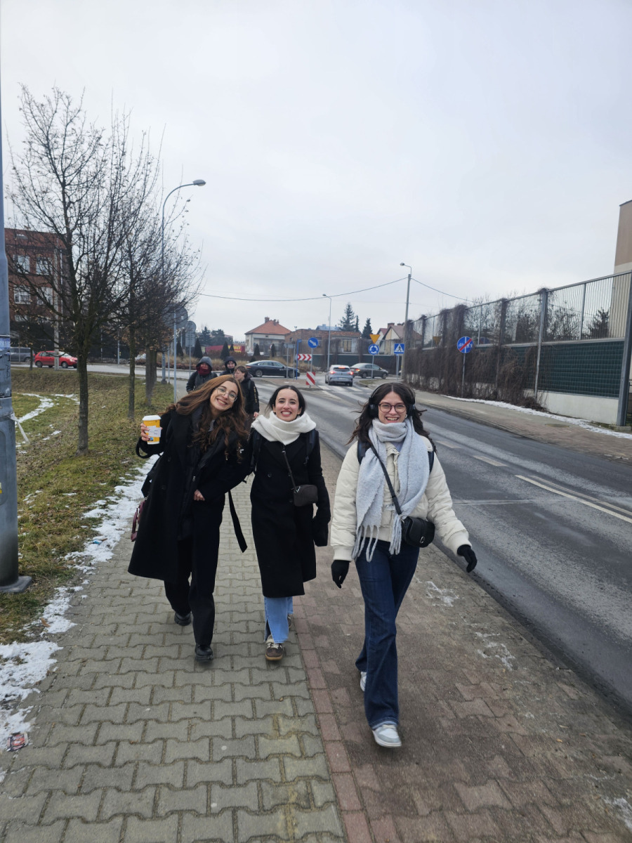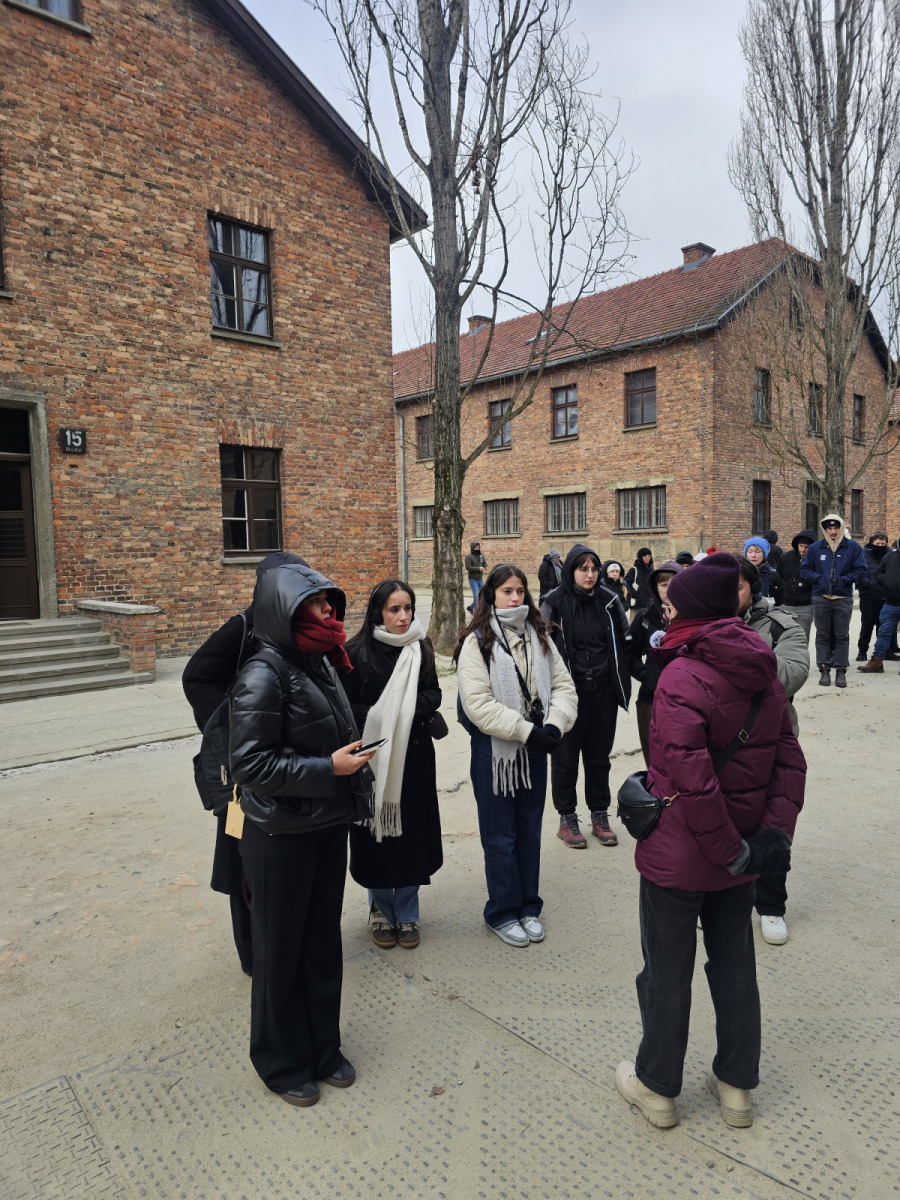 W sobotę 31 stycznia grupa zebrała się na Dworcu Głównym w Krośnie, skąd udaliśmy się pociągiem do Krakowa, gdzie po szybkiej przesiadce znaleźliśmy się na pokładzie pociągu zmierzającego do stacji Oświęcim – Główny. Studenci odsypiali poprzednią noc w pociągu, co widoczne jest na pierwszych zdjęciach poniżej. Po dotarciu do Oświęcimia zatrzymaliśmy się na rozgrzewającą herbatę, po czym wyruszyliśmy do Miejsca Pamięci. Zwiedzanie trwało niemal 4 godziny i odbyło się w języku angielskim, w towarzystwie edukatora muzeum. Pomimo mrozu sięgającego -15 stopni, studenci z zainteresowaniem i powagą wysłuchali edukatora, zadając tym samym wiele pytań. Warto wspomnieć, że studenci sami zasugerowali miejsce tego wyjazdu, historia Miejsca Pamięci Auschwitz-Birkenau była dla nich niezwykle istotna ze względu swoje wartości, przekonania i historie rodzinne. Dzień zakończył się wspólną kolacją oraz zakwaterowaniem w jednym z krakowskich hoteli.
