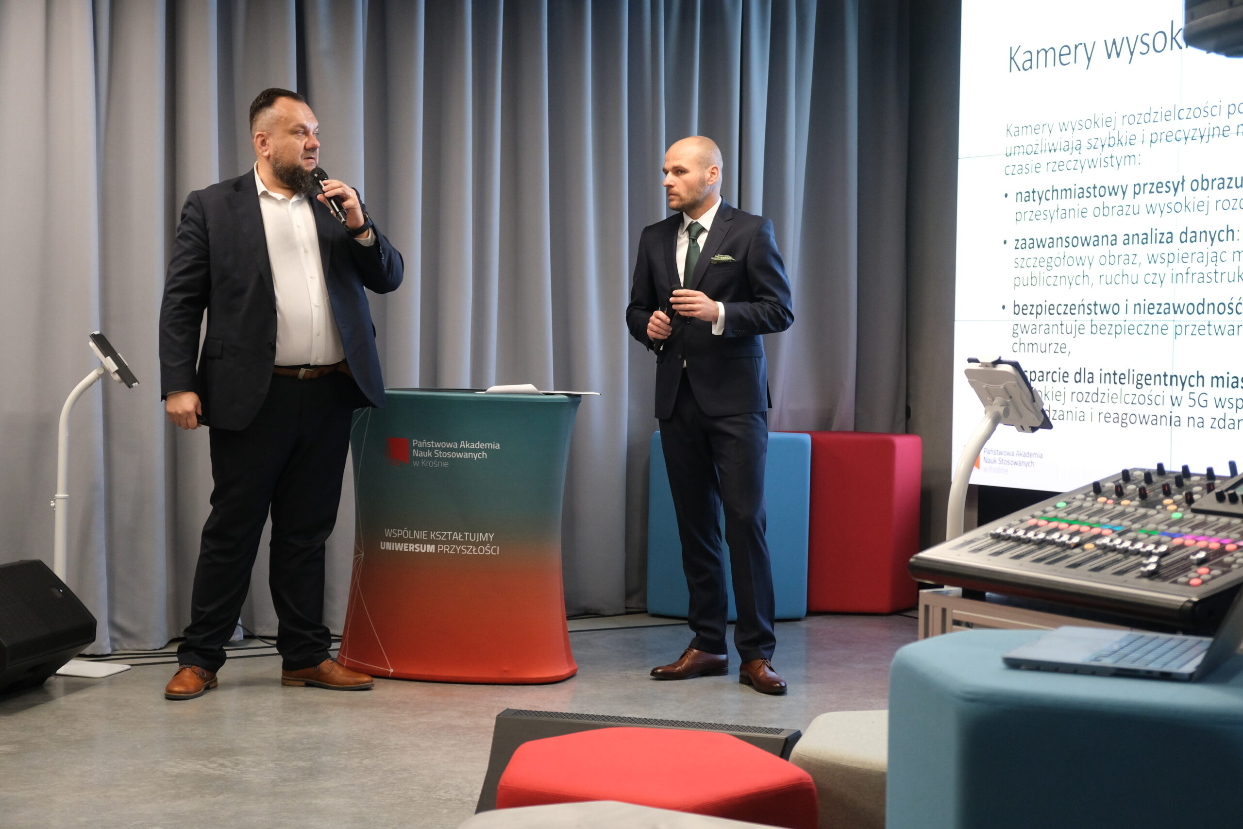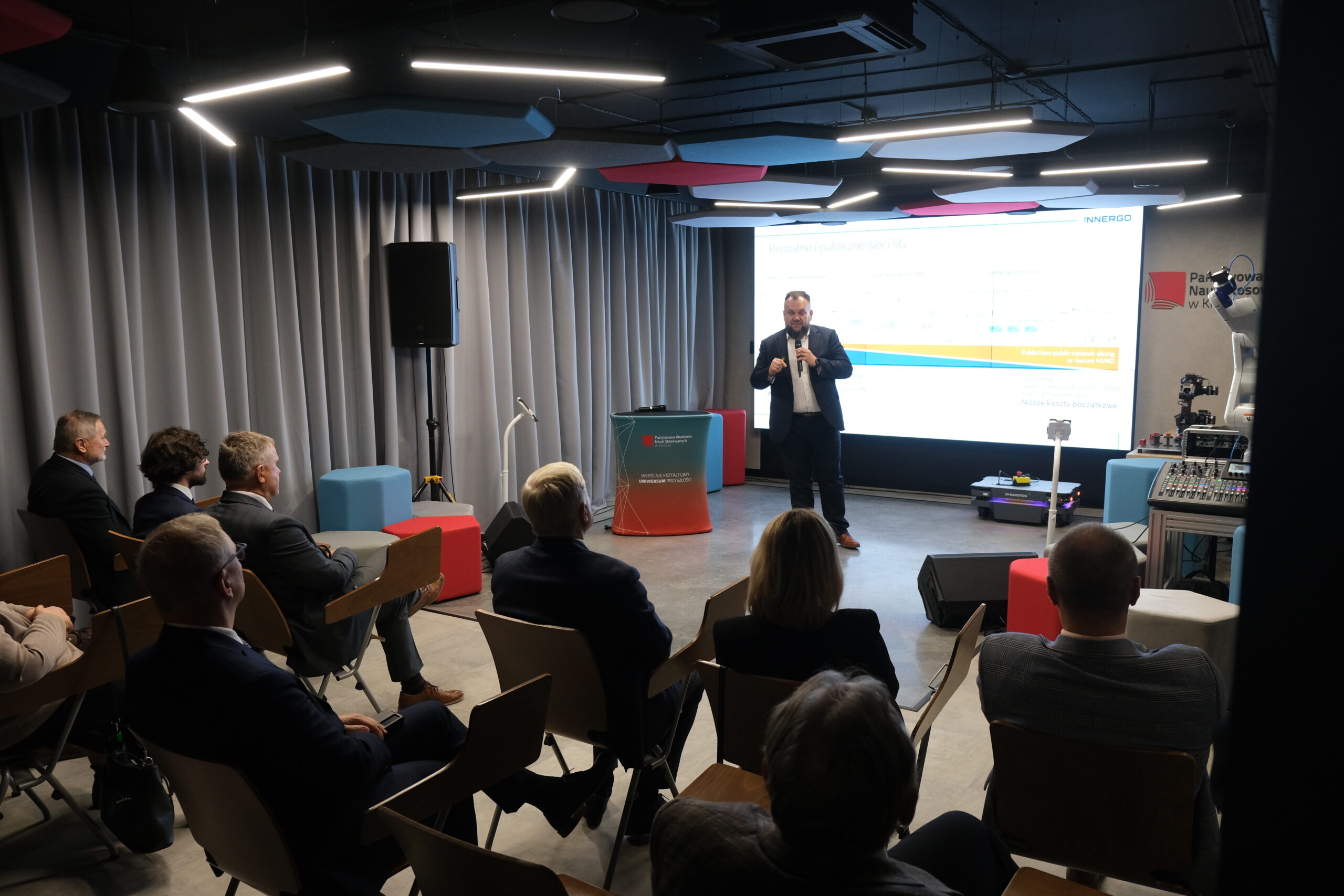 Prezentacja możliwości laboratorium była jednym z kluczowych momentów uroczystości – poprowadzili ją wspólnie wykładowca PANS w Krośnie Daniel Biały oraz Łukasz Włodarczyk – specjalista firmy Innergo Systems. Goście mieli okazję zobaczyć praktyczne zastosowania 5G – od zaawansowanych aplikacji VR/AR, po systemy analizy obrazu i rozwiązania z zakresu Internetu Rzeczy (IoT). Pokazano, jak laboratorium może wspierać lokalnych przedsiębiorców i startupy, umożliwiając im testowanie oraz rozwój innowacyjnych produktów.