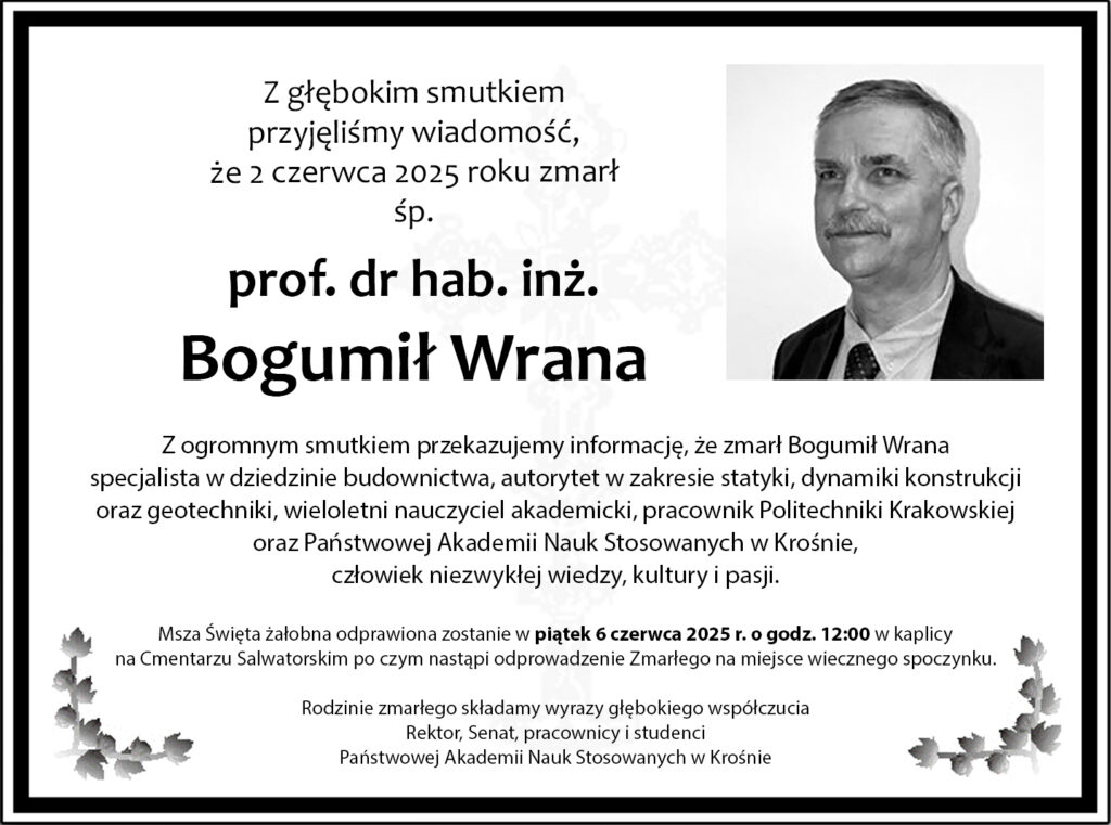 3 czerwca 2025 roku dotarła do nas smutna wiadomość, że odszedł od nas wybitny inżynier, naukowiec i nauczyciel akademicki – Profesor Bogumił Wrana, którego dorobek i postawa na zawsze pozostaną w pamięci wielu pokoleń studentów, współpracowników i przyjaciół.
