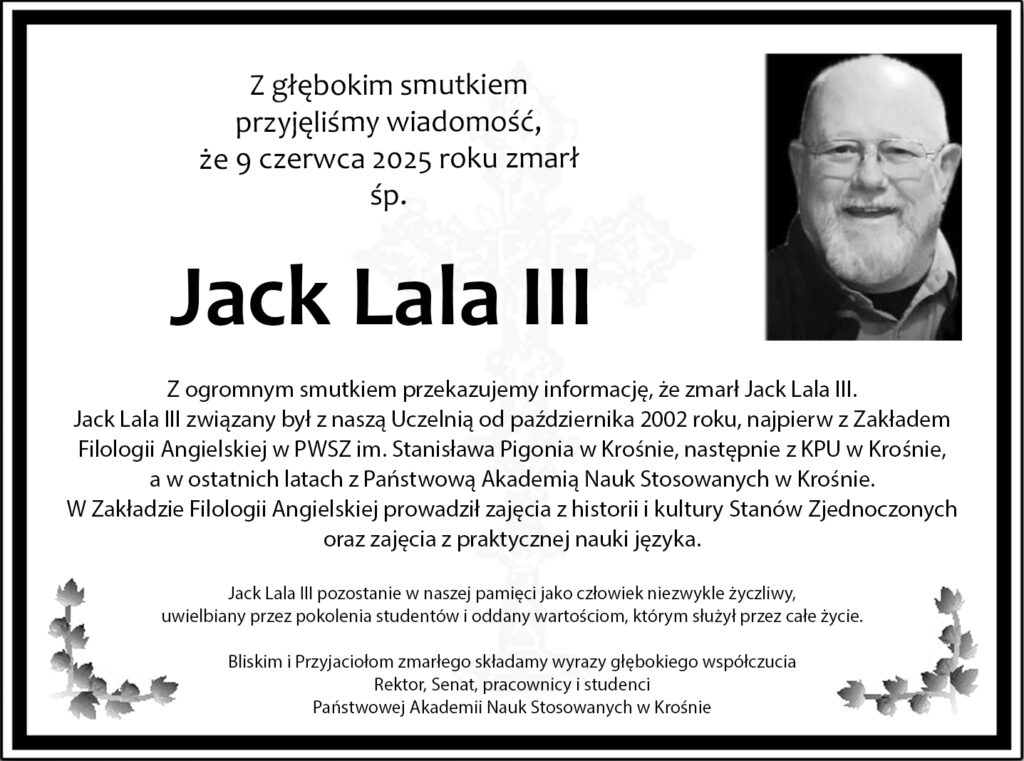 9 czerwca 2025 roku odszedł od nas  wykładowca Jack Lala III. Jack pozostanie w naszej pamięci jako człowiek niezwykle życzliwy, uwielbiany przez pokolenia studentów i oddany wartościom, którym służył przez całe życie.