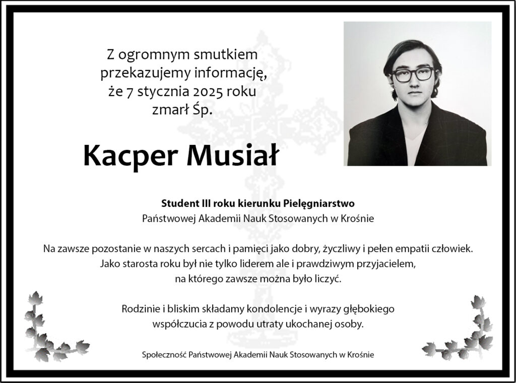 7 stycznia 2025 odszedł Kacper Musiał student III roku kierunku Pielęgniarstwo. Był młodym człowiekiem o wielkim sercu i niezwykłej wrażliwości co czyniło go wyjątkowym. Jako starosta roku był nie tylko liderem ale i prawdziwym przyjacielem, na którego można było zawsze liczyć. Nauka była jego pasją.