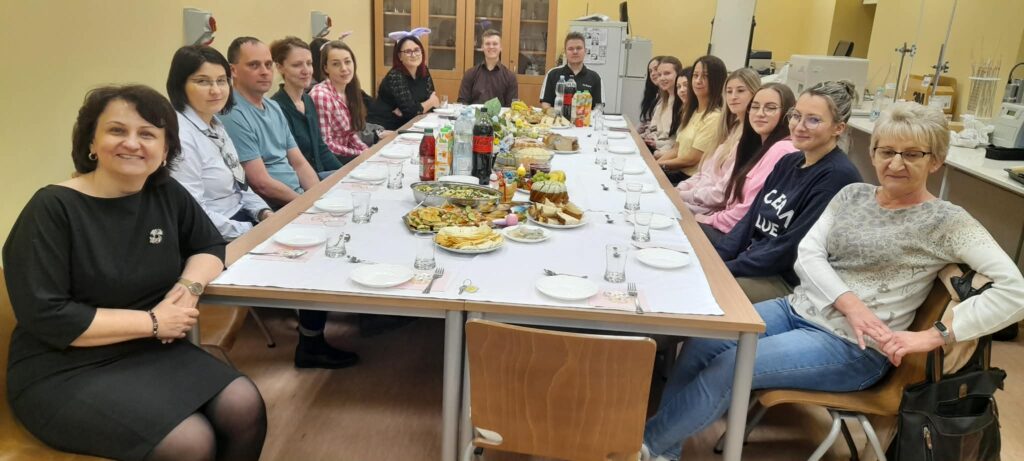 W dniu 27 marca 2026 r. odbyło się spotkanie wielkanocne zorganizowane przez studentów II roku kierunku Produkcja i Bezpieczeństwo Żywności. Wydarzenie przebiegło w miłej i serdecznej atmosferze. Sala została przygotowana w świątecznym klimacie – na stole znalazł się tradycyjny baranek wielkanocny oraz pisanki, a także różnorodne potrawy wielkanocne oraz domowe ciasta, które cieszyły się dużym zainteresowaniem uczestników.