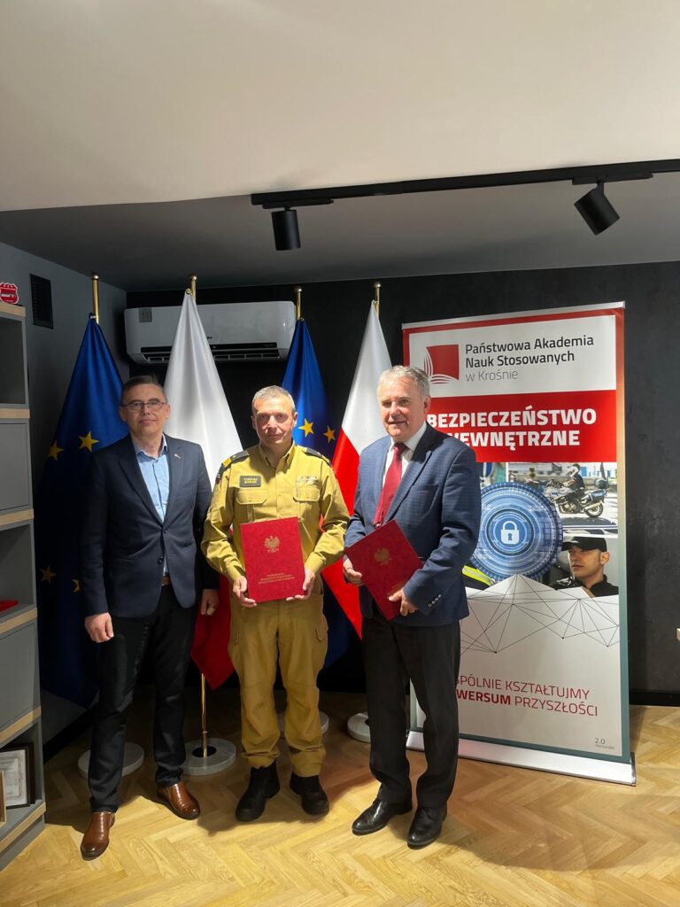 W dniu 25 marca 2026 r. w Rzeszowie doszło do podpisania porozumienia pomiędzy Państwową Akademią Nauk Stosowanych w Krośnie, a Komendą Wojewódzką Państwowej Straży Pożarnej w Rzeszowie. Uczelnię reprezentowali: Rektor dr hab. Zbigniew Barabasz, prof. PANS oraz dr Jacek Kraś – kierownik Zakładu Bezpieczeństwa Wewnętrznego. Natomiast Komendę Wojewódzką PSP, Podkarpacki Komendant Wojewódzki PSP nadbryg. Tomasz Baran.