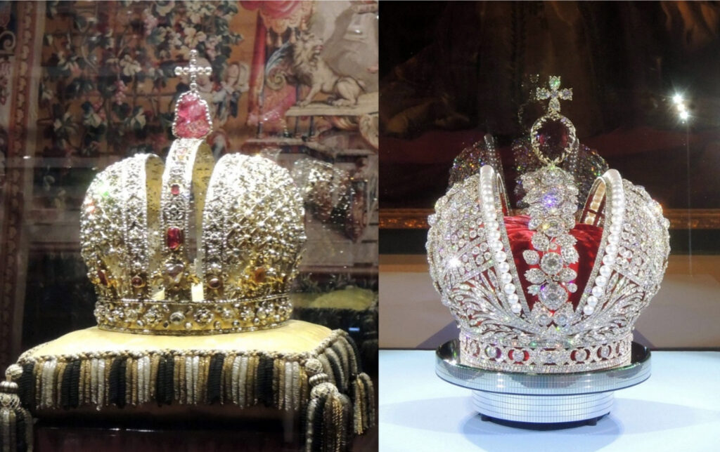 Ceremonialne korony rosyjskie: korona cesarzowej Anny Iwanowny (1730-1740) (po lewej) i korona Katarzyny II (1762-1796), która zainicjowała i dokonała trzech rozbiorów Rzeczypospolitej (po prawej), przechowywane w kremlowskim muzeum (źródło: domena publiczna)