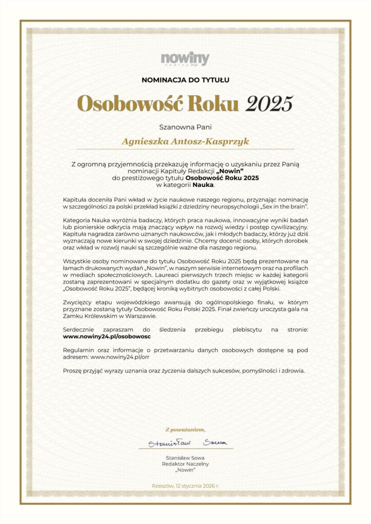 Mgr Agnieszka Antosz-Kasprzyk, wykłądowca Studium Języków Obcych, została nominowana w kategorii Nauka za polski przekład książki z dziedziny neuropsychologii „Sex in the brain”. Głosowanie będzie trwać do czwartku, 12 marca 2026 r. do godz. 20:30. Jeśli chcecie wesprzeć naszego lektora, swój głos możecie oddać na stronie internetowej Nowin link