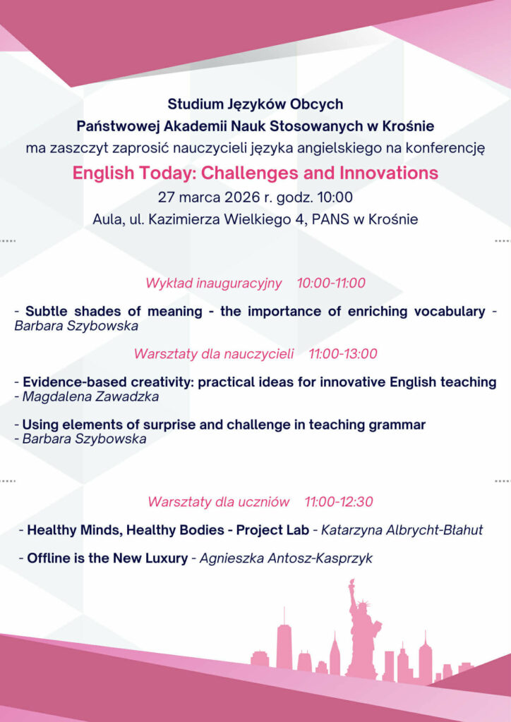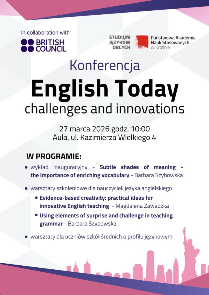 Zapraszamy nauczycieli języka angielskiego na II Konferencję English Today – challenges and innovations. Liczymy, że tak jak w ubiegłym roku, w gronie kilkudziesięciu anglistów z naszego regionu, spotkamy się na ciekawym wykładzie i warsztatach oraz porozmawiamy o naszych edukacyjnych doświadczeniach.