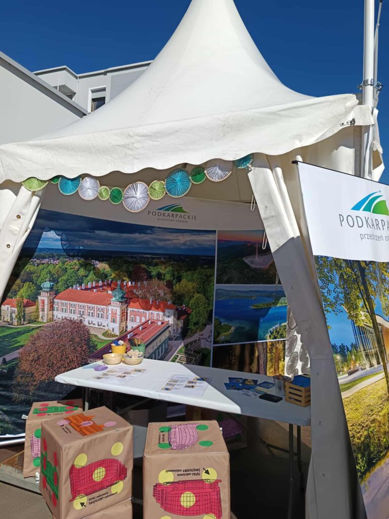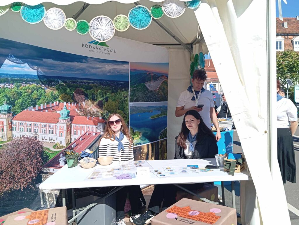 Przygotowałyśmy również wiele gadżetów promujących Podkarpacie – rozdawałyśmy pocztówki, ulotki informacyjne oraz drobne pamiątki, które przyciągały uwagę i zachęcały do rozmów o naszym regionie.