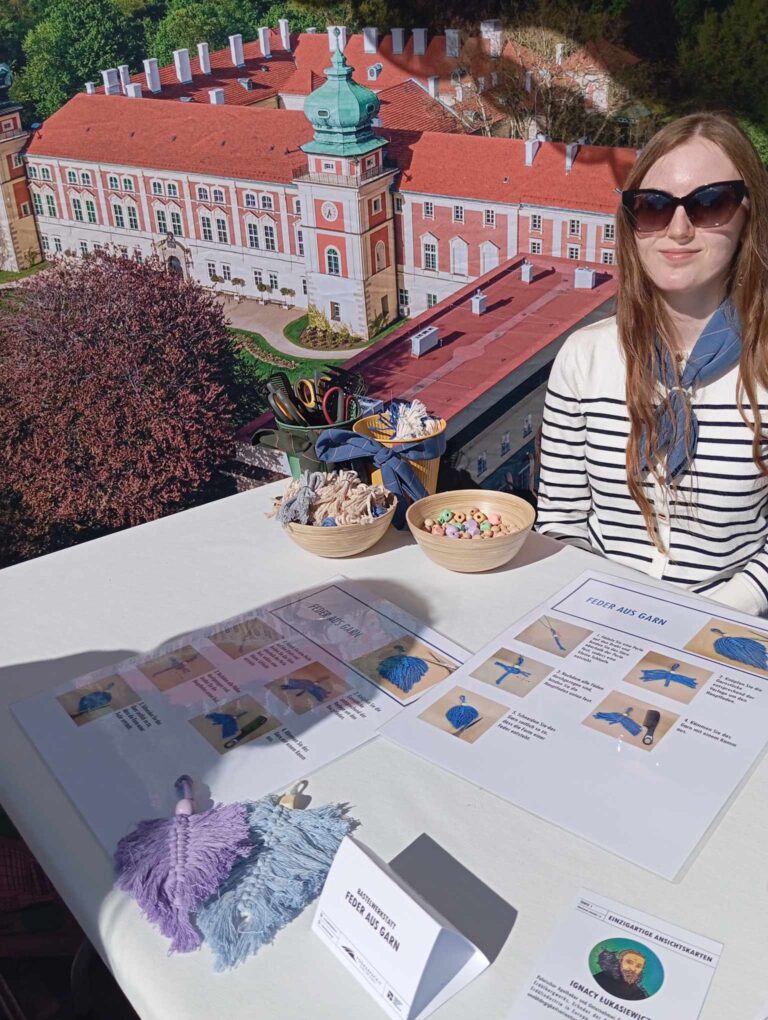 Prowadziłyśmy również warsztaty artystyczne, podczas których uczestnicy mogli własnoręcznie wykonać motanki (tradycyjne słowiańskie laleczki), piórka z makramy, zakładki do książek oraz kwiaty z bibuły – przykłady podkarpackiego rękodzieła ludowego. Zainteresowanie było ogromne, a wspólne tworzenie przyniosło wszystkim wiele radości.