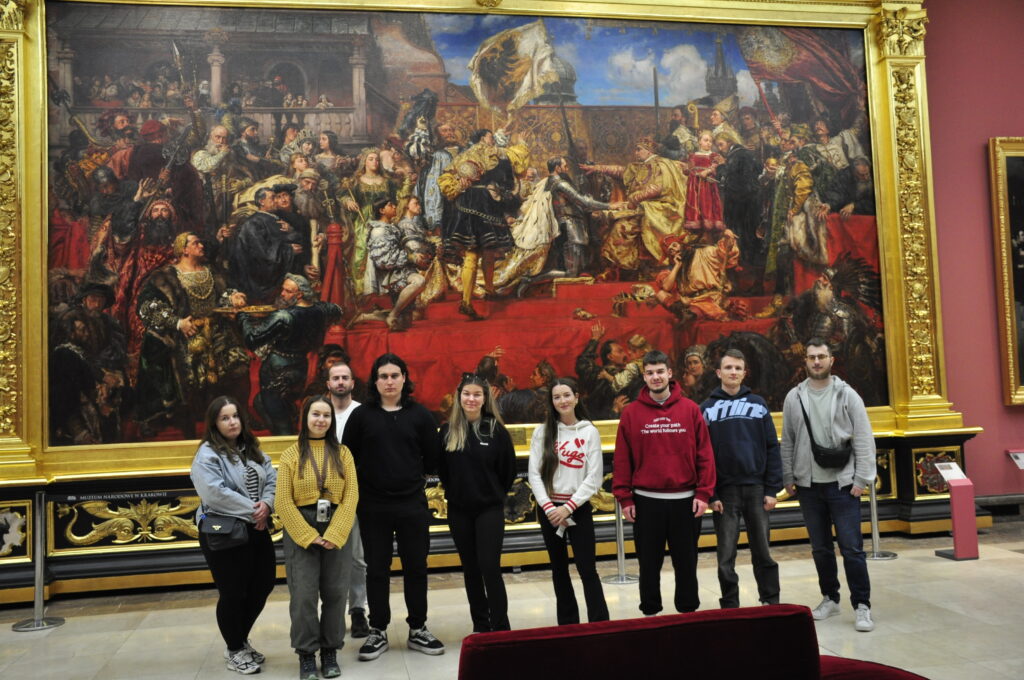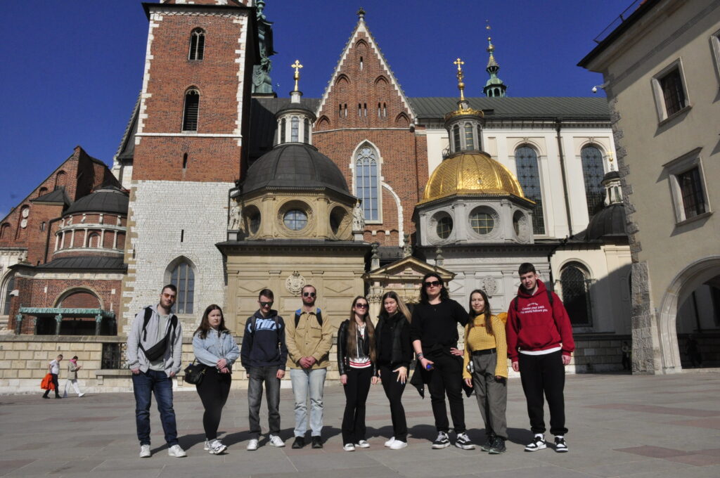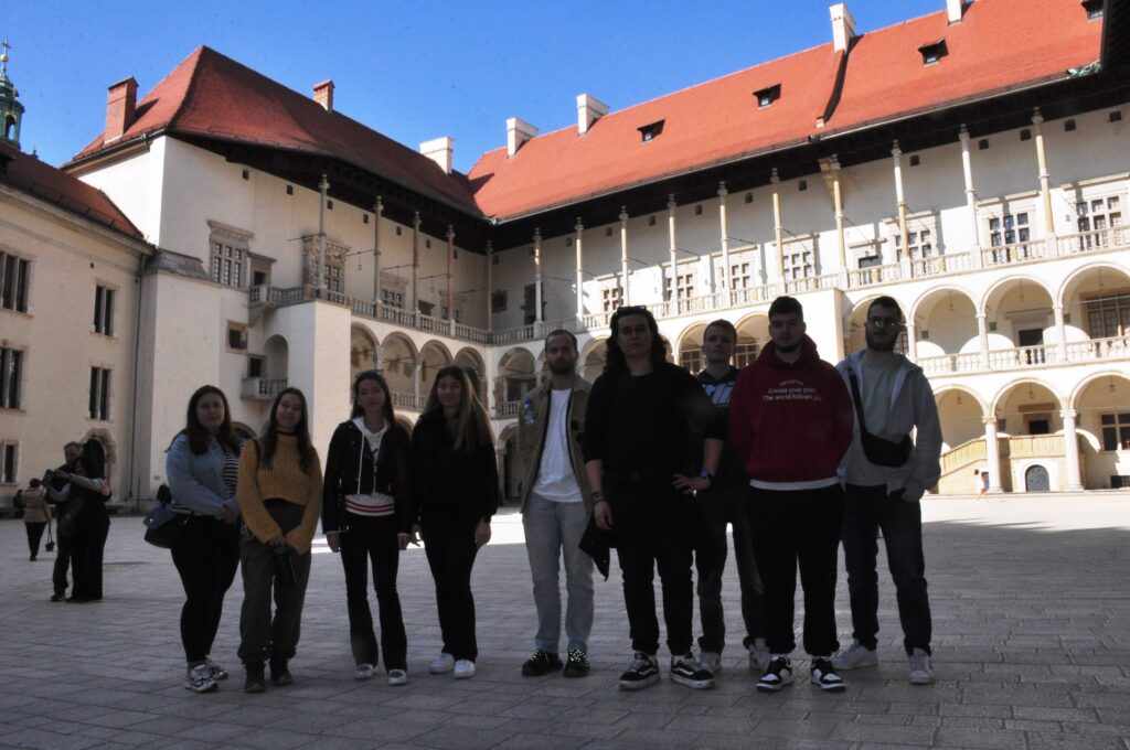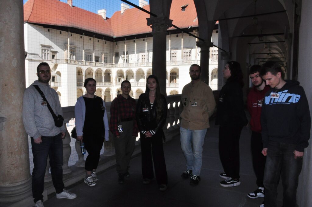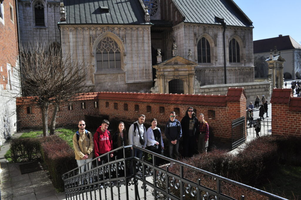 Zajęcia w Krakowie rozpoczęliśmy wzgórza wawelskiego, gdzie głównym punktem programu były Komnaty reprezentacyjne II piętra Zamku Królewskiego na Wawelu. Po ponad dwóch godzinach intensywnych zajęć kolejnym punktem programu był Skarbiec Koronny i Zbrojownia, gdzie prócz licznych artefaktów ze srebra i złota studenci mogli wejść do historycznego pomieszczenia dawnego Skarbca gdzie eksponowany jest tzw. Szczerbiec – miecz koronacyjny królów polskich z 2. poł. XIII wieku. Ze Skarbca i Zbrojowni przez dziedziniec arkadowy przeszliśmy do nowej ekspozycji Zamku jakim jest Lapidarium utworzone w piwnicach wschodniego skrzydła. Ostatnie dwa punkty programu to archeologiczno-architektoniczna wystawa Wawel zaginiony, dotycząca historii zabudowy wzgórza wawelskiego, gdzie studenci mogli zobaczyć najstarsze na ziemiach polskich architektoniczne relikty rotundy Najświętszej Marii Panny, pochodzące z czasów Bolesława Chrobrego, oraz najnowsza ekspozycja o nazwie Międzymurze, prezentująca wyniki archeologicznych badań w obrębie fortyfikacji wawelskich. Późnym popołudniem zajęcia zakończyliśmy w Galerii w Sukiennicach – Oddziale Muzeum Narodowego w Krakowie, gdzie studenci zobaczyli najwspanialsze dzieła malarzy polskich XIX wieku: Piotra Michałowskiego, Jana Matejki, Józefa Chełmońskiego, Henryka Siemiradzkiego, Aleksandra i Maksymiliana Gierymskich i wielu, wielu innych.