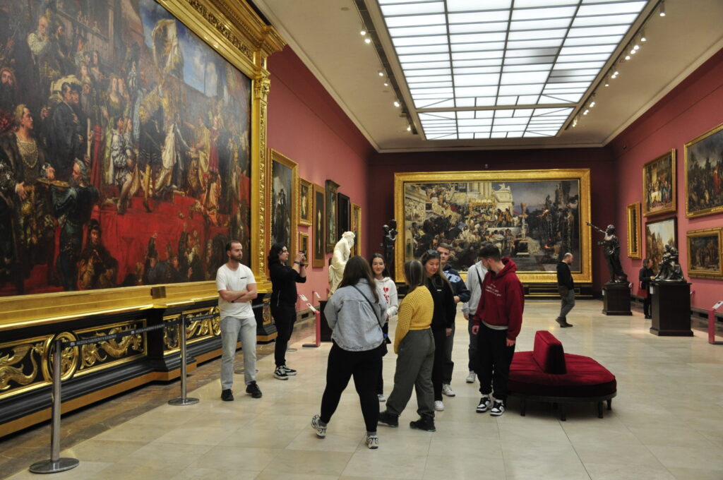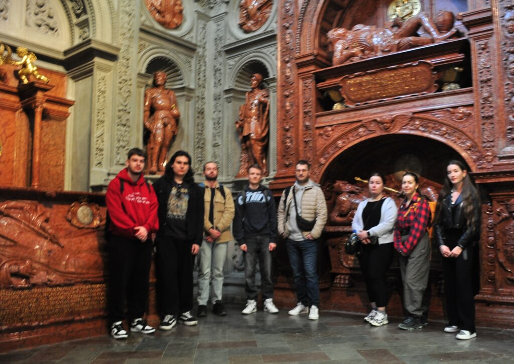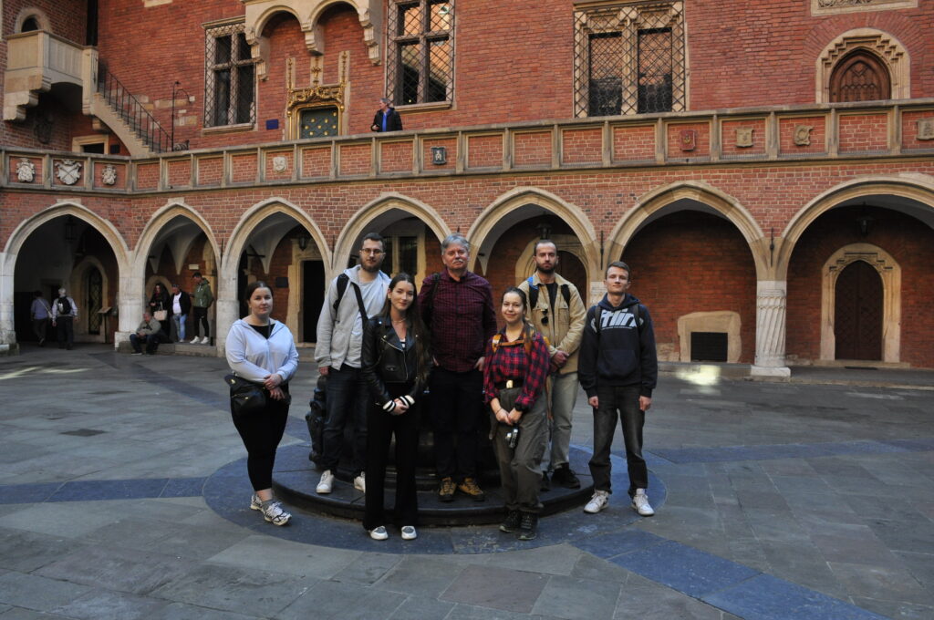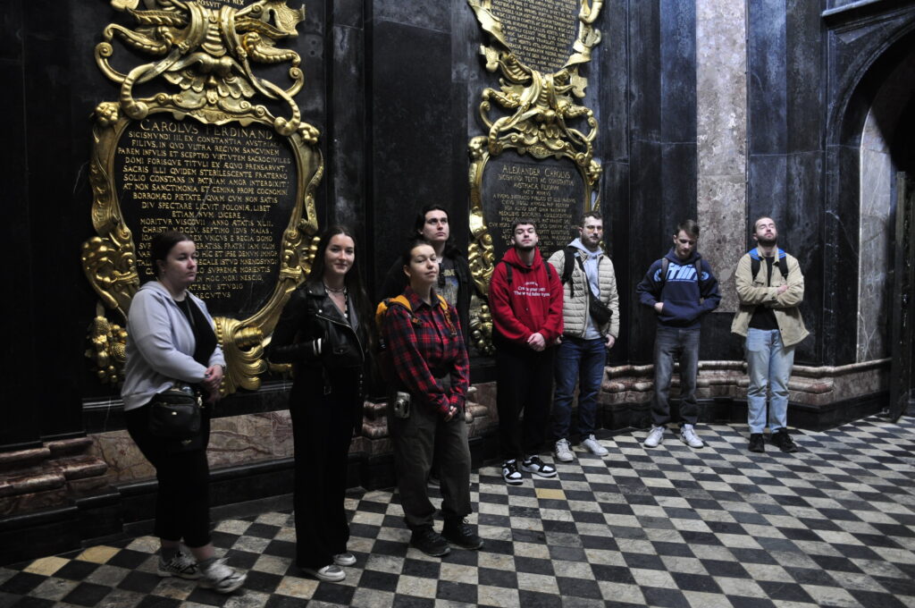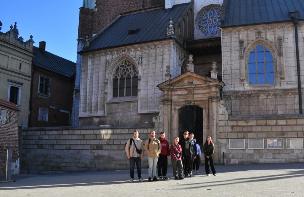 Zajęcia w Krakowie rozpoczęliśmy wzgórza wawelskiego, gdzie głównym punktem programu były Komnaty reprezentacyjne II piętra Zamku Królewskiego na Wawelu. Po ponad dwóch godzinach intensywnych zajęć kolejnym punktem programu był Skarbiec Koronny i Zbrojownia, gdzie prócz licznych artefaktów ze srebra i złota studenci mogli wejść do historycznego pomieszczenia dawnego Skarbca gdzie eksponowany jest tzw. Szczerbiec – miecz koronacyjny królów polskich z 2. poł. XIII wieku. Ze Skarbca i Zbrojowni przez dziedziniec arkadowy przeszliśmy do nowej ekspozycji Zamku jakim jest Lapidarium utworzone w piwnicach wschodniego skrzydła. Ostatnie dwa punkty programu to archeologiczno-architektoniczna wystawa Wawel zaginiony, dotycząca historii zabudowy wzgórza wawelskiego, gdzie studenci mogli zobaczyć najstarsze na ziemiach polskich architektoniczne relikty rotundy Najświętszej Marii Panny, pochodzące z czasów Bolesława Chrobrego, oraz najnowsza ekspozycja o nazwie Międzymurze, prezentująca wyniki archeologicznych badań w obrębie fortyfikacji wawelskich. Późnym popołudniem zajęcia zakończyliśmy w Galerii w Sukiennicach – Oddziale Muzeum Narodowego w Krakowie, gdzie studenci zobaczyli najwspanialsze dzieła malarzy polskich XIX wieku: Piotra Michałowskiego, Jana Matejki, Józefa Chełmońskiego, Henryka Siemiradzkiego, Aleksandra i Maksymiliana Gierymskich i wielu, wielu innych.