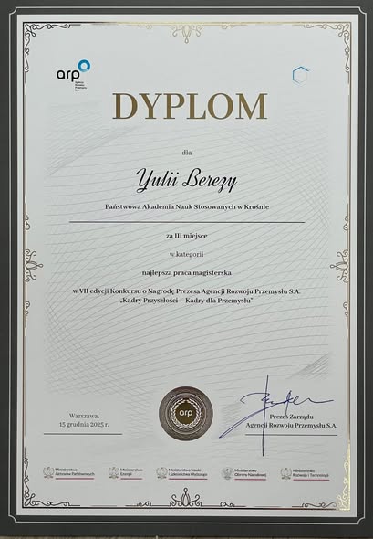 Mgr Yuliia Bereza – tegoroczna absolwentka PANS w Krośnie (studia drugiego stopnia kierunku Zarządzanie), znalazła się w gronie laureatów VII edycji Konkursu o Nagrodę Prezesa Agencji Rozwoju Przemysłu S.A. na najlepszą pracę licencjacką, inżynierską, magisterską „Kadry dla Przemysłu”.