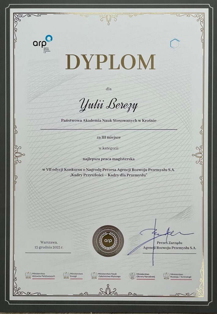 Mgr Yuliia Bereza – tegoroczna absolwentka PANS w Krośnie (studia drugiego stopnia kierunku Zarządzanie), znalazła się w gronie laureatów VII edycji Konkursu o Nagrodę Prezesa Agencji Rozwoju Przemysłu S.A. na najlepszą pracę licencjacką, inżynierską, magisterską „Kadry dla Przemysłu”.